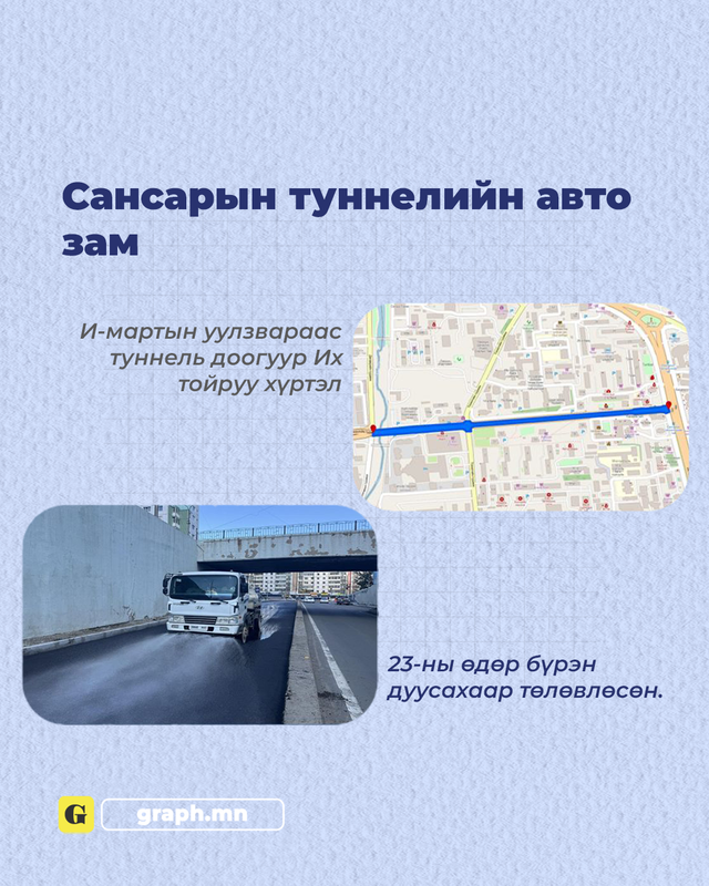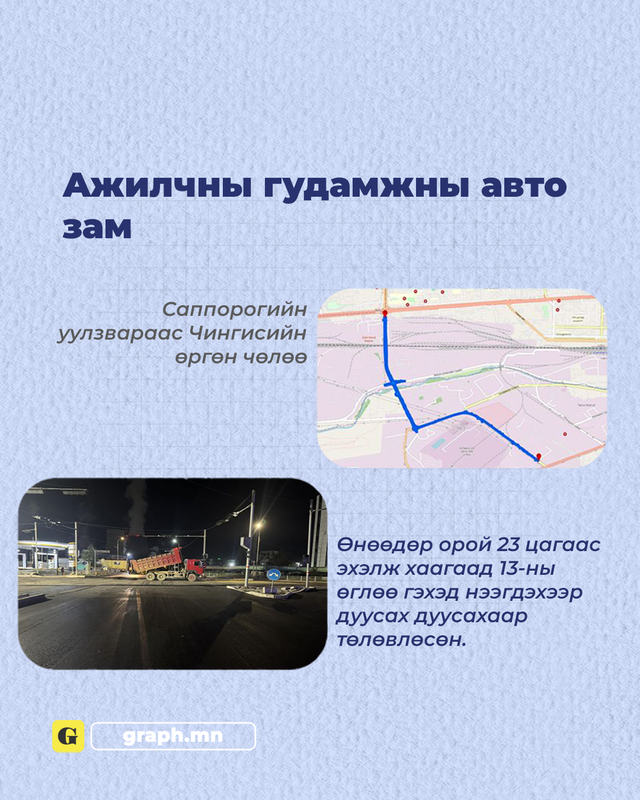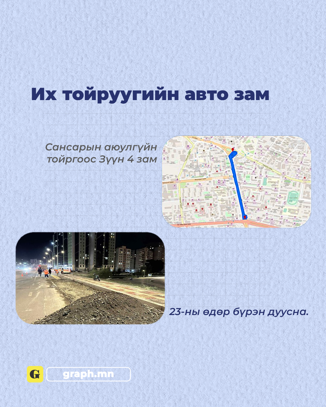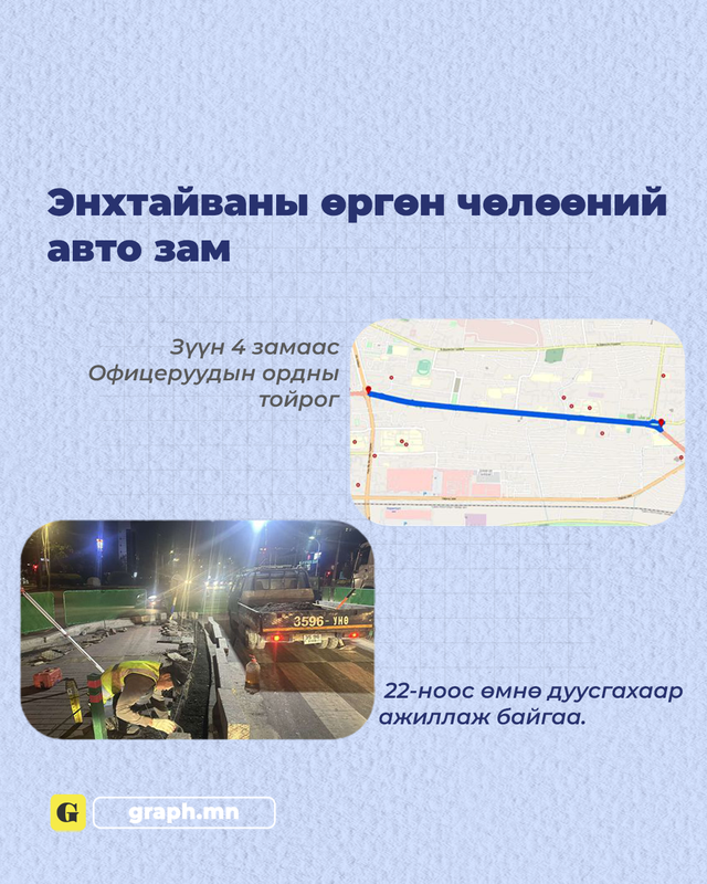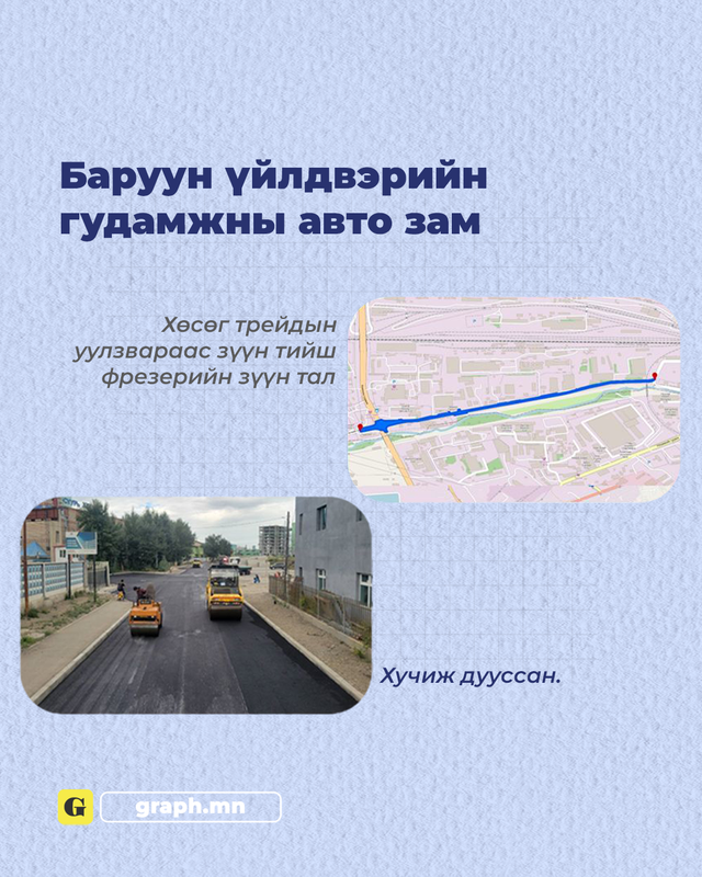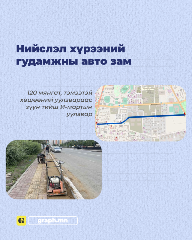Тэр “2025 онд нийслэлийн 44 байршилд авто замын засвар, шинэчлэлтийн ажил хийхээр төлөвлөсөн. Өнөөдрийн байдлаар нийт 34 байршилд 100.9 км авто замын шинэчлэлтийн ажил дууссан. Мөн 10 байршилд 14.15 км суурь хучилтын ажил график төлөвлөгөөний дагуу үргэлжилж байгаа” гэв.