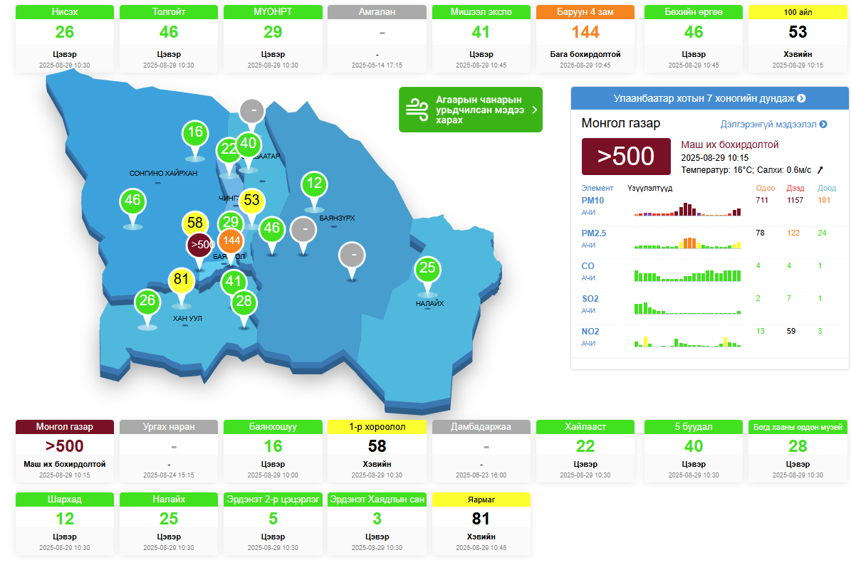 Тэгвэл өнөөдөр (2025.08.29) Улаанбаатар хотод мөн л +21 градусын дулаан. Гэтэл өглөөний 10:45 цагийн байдлаар Баруун 4 зам орчмын PM10 буюу агаар дахь нарийн ширхэгт тоосонцрын хэмжээ 144 буюу бага бохирдолтой гэх түвшинд хүрчээ. Энэ хэмжээ нь хэт мэдрэг хүмүүсийн эрүүл мэндэд сөргөөр нөлөөлөхүйц үзүүлэлт юм.