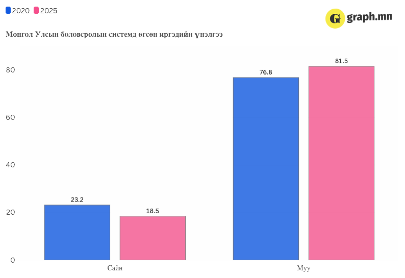“Datamon” судалгааны байгууллагын “Монгол Улсын нийгмийн үеийн судалгаа 2025”-д Монгол Улсын боловсролын системийг муу гэж үнэлсэн иргэдийн тоо сүүлийн таван жилд 4.7 хувиар өссөн талаар дурджээ.