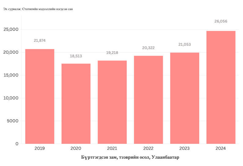 Дээрх графикаас харахад сүүлийн дөрвөн жилийн хугацаанд зам, тээврийн ослын тоо тогтмол нэмэгдсэн бөгөөд 2024 онд хамгийн их буюу таван мянгаар өссөн байна.
