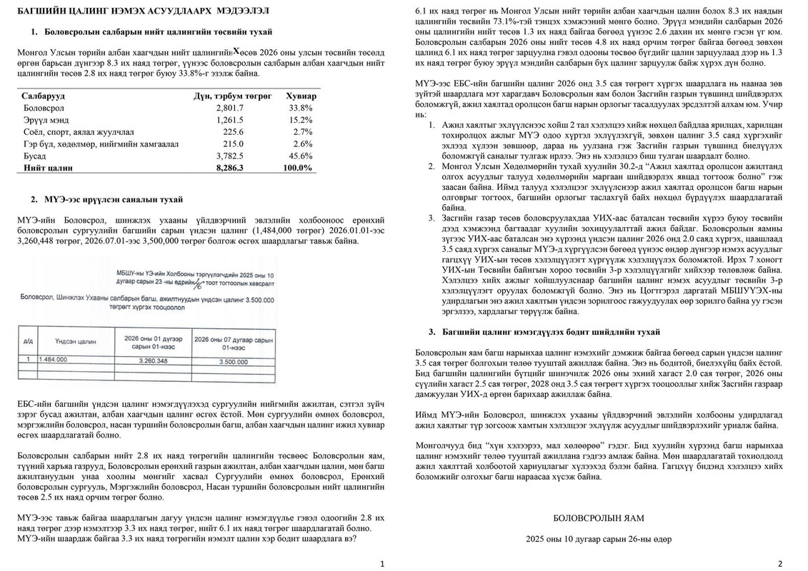 Уриалгадаа багшийн цалинг нэмэх бодит боломжийн тухай дурдсан ба 2026 оны эхний хагаст 2 сая, 2026 оны сүүлийн хагаст 2.5 сая, 2028 онд 3.5 сая төгрөг болгохоор ажиллаж байна хэмээжээ.
