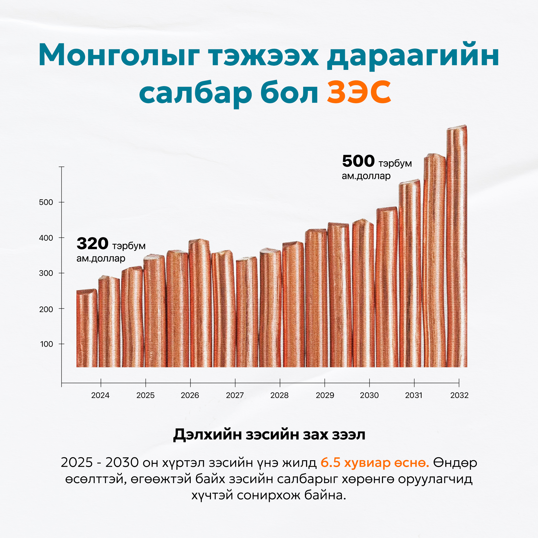 Гуравдугаарт, АМНАТ өндөр бол зэсийн салбарт үүсэж буй боломжоо алдана. Дэлхийн зэсийн зах зээл 2024 оны байдлаар 320 тэрбум ам.доллароор хэмжигдэж байгаа бол найман жилийн дараа 500 шахам тэрбум ам.долларт хүрнэ. Жил бүр 5-6 хувийн өсөлт үзүүлнэ гэсэн үг. Хятад гэхэд цахилгаан машин үйлдвэрлэлийг дэмжсэнээр зэсийн эрэлт жил бүр 100 гаруй мянган тонноор нэмэгдэж байна. Мэдээж эрэлт нэмэгдсэнээр үнэ өснө. Уг үнийн өсөлтийг манай улс төсөвтөө шингээж, ард түмний амьдрал ахуй, улс орны хөгжлийг дэмжихэд зориулах учиртай. Өөрөөр хэлбэл, зэсийн үнийн өсөлтийн циклийг бид алдаж болохгүй. Гэвч зэсэд ногдуулах АМНАТ-ийг өндөр тооцсоноор үйлдвэрүүд үйл ажиллагаагаа өргөжүүлэх боломжгүй болно. Нөгөө талаас хөрөнгө оруулагчид Монголд орж ирэхгүй. “Эрдэнэт үйлдвэр” төрийн 100 хувийн өмчит тул шахуулаад 20 гаруй хувийн АМНАТ төлөөд үлдсэнээр нь цалин хангамжаа болгоод яваад байгаа болохоос биш ашиг хийхээр орж ирсэн хөрөнгө оруулагчид энэ нөхцөлийг зөвшөөрөхгүй. Ингээд тооцохоор АМНАТ-ийн төлбөрийг өндөр тогтоох нь богино хугацаанд төсөв бүрдүүлэлтэд ашигтай мэт боловч дунд, урт хугацаанд зэсийн үнэ өндөр байх үед хүртэх өгөөжийг бууруулах эрсдэлтэй байна.