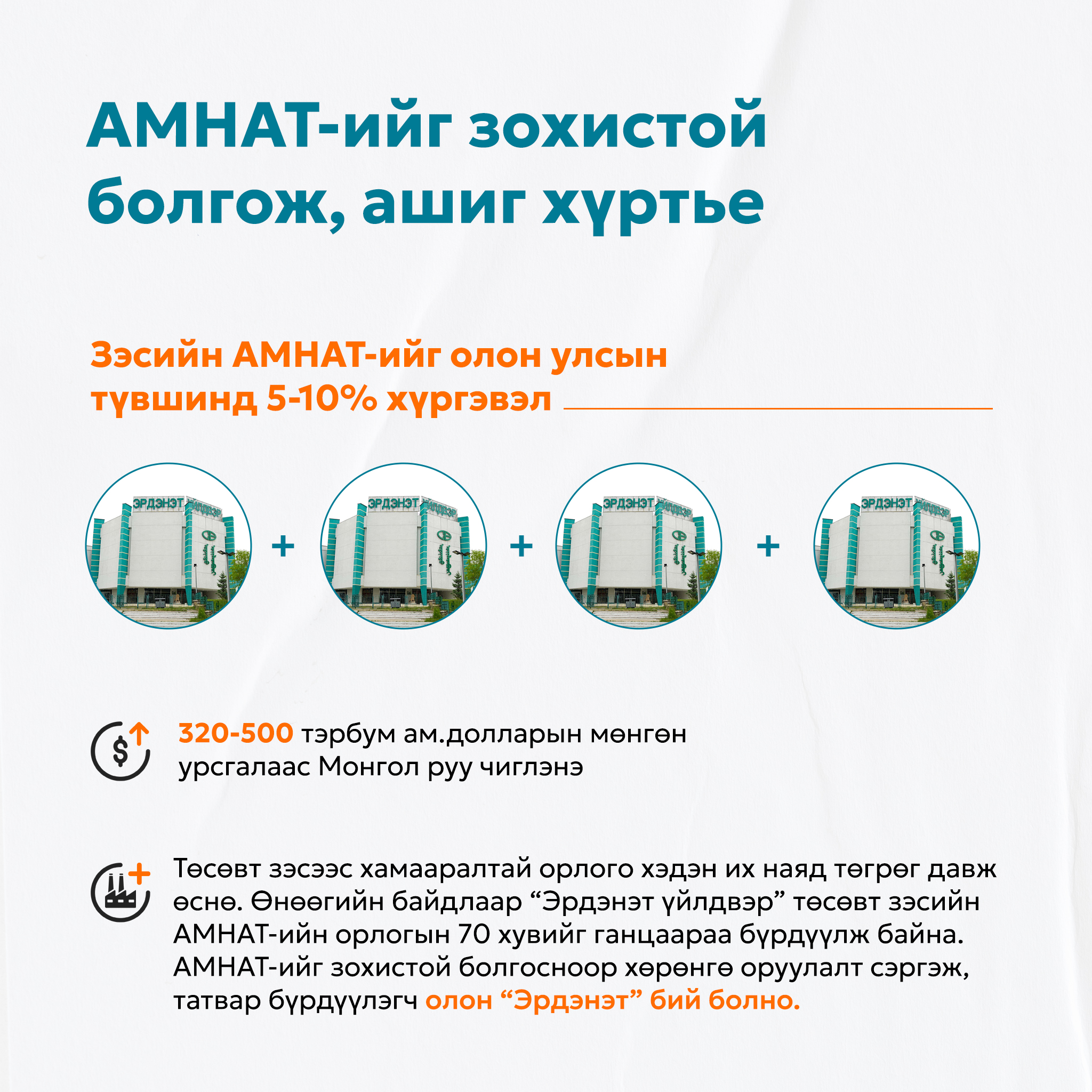 Тэгвэл “Эрдэнэт үйлдвэр”-ийн хүчин чадлыг нэмэгдүүлж, зардлыг бууруулахад техник технологийн шинэчлэлийг тогтмол хийх шаардлагатай. Үүнд мөнгө хэрэгтэй.