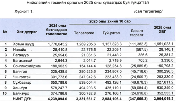 Энэ оны төсвийн хүлээгдэж буй гүйцэтгэлийг харвал 2025 онд 4,2 тэрбум төгрөгийн орлогыг төвлөрүүлэхээр батлагдсан ч 10-р сарын төсвийн гүйцэтгэлийн байдлаар 2,9 их наядын орлого төвлөрчээ.