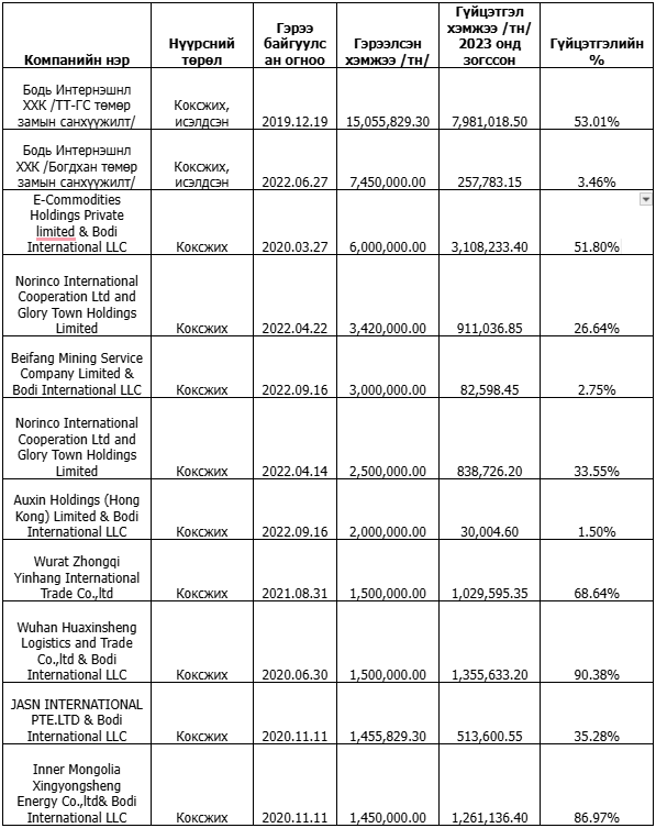 Хамгийн өндөр дүнтэй гэрээнүүдийг 2020 онд байгуулсан бөгөөд 2023 онд Засгийн газрын шийдвэрээр эдгээр гэрээний хэрэгжилтийг зогсоосон байдаг. Энэ хугацаанд өндөр дүнтэй буюу 1.4-15 сая тонн хүртэлх нүүрс нийлүүлэх оффтэйк гэрээнүүдийн гүйцэтгэл 50-90 хувьтай байсныг харж болно.