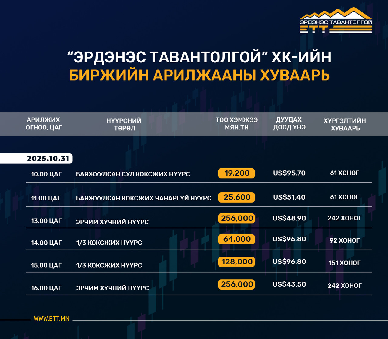 "Эрдэнэс тавантолгой" ХК-ийн 2025 оны 10 дугаар сарын 31-ний өдрийн биржийн арилжааны хуваарь