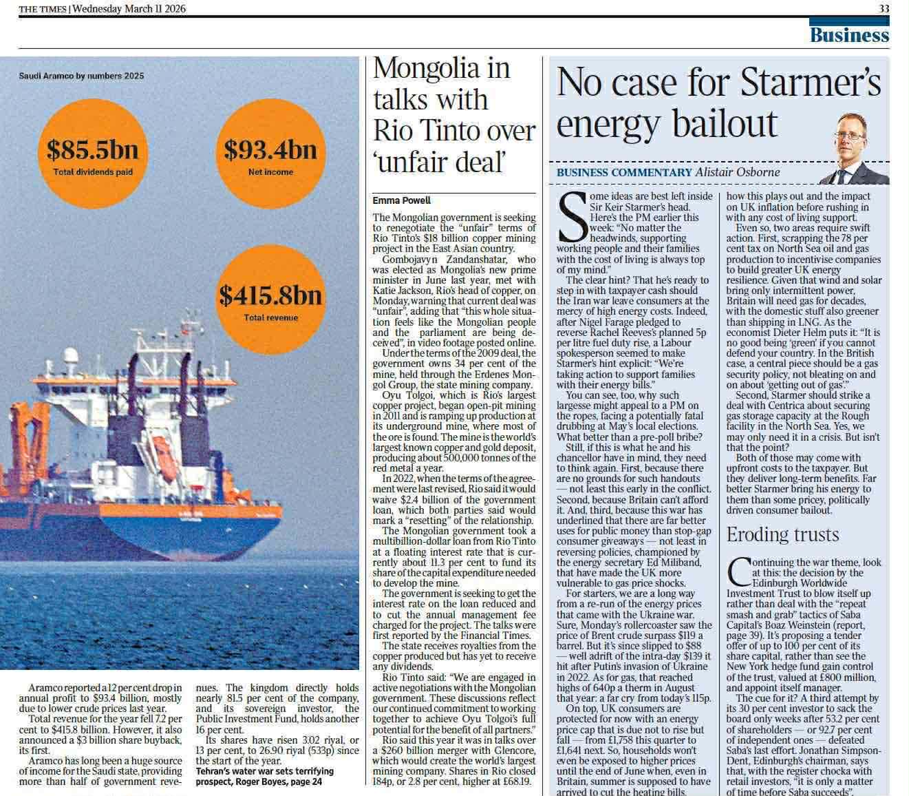Оюу Толгойн гэрээний шударга бус заалтыг өөрчлөх Ерөнхий сайд Г.Занданшатарын шаардлагын талаар “The Times” сониноос гадна “The Wall street journal”, “Reuters”, “Financial times”, “Bloomberg” зэрэг дэлхийн ТОП хэвлэл мэдээллийн байгууллагууд онцлон мэдээлсээр байна.