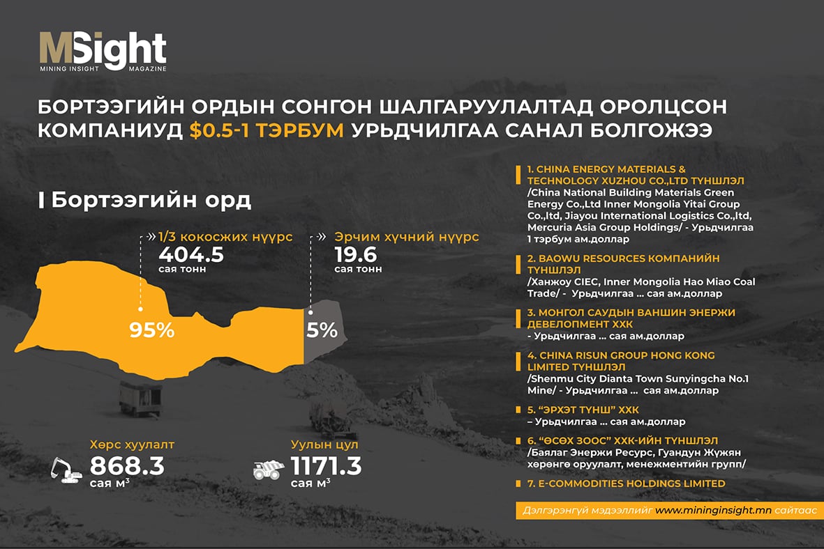 Өнөөдөр Бортээгийн ордод хөрөнгө оруулахаар 7 компани хүсэлтээ ирүүлж, 500 саяас 1 тэрбум ам.долларын урьдчилгаа төлбөрийн санал ирүүлээд байна.