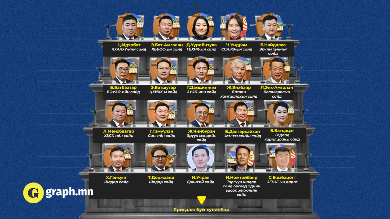 Мөн өчигдөр томилогдсон 35 дахь Ерөнхий сайд Ням-Осорын Учрал Засгийн газрын бүрэлдэхүүнээ Ерөнхийлөгчтэй зөвшилцөн УИХ-аар хэлэлцүүлэх төлөвтэй байна. Одоогоор түүний танхим дараах байдлаар яригдаж байна.