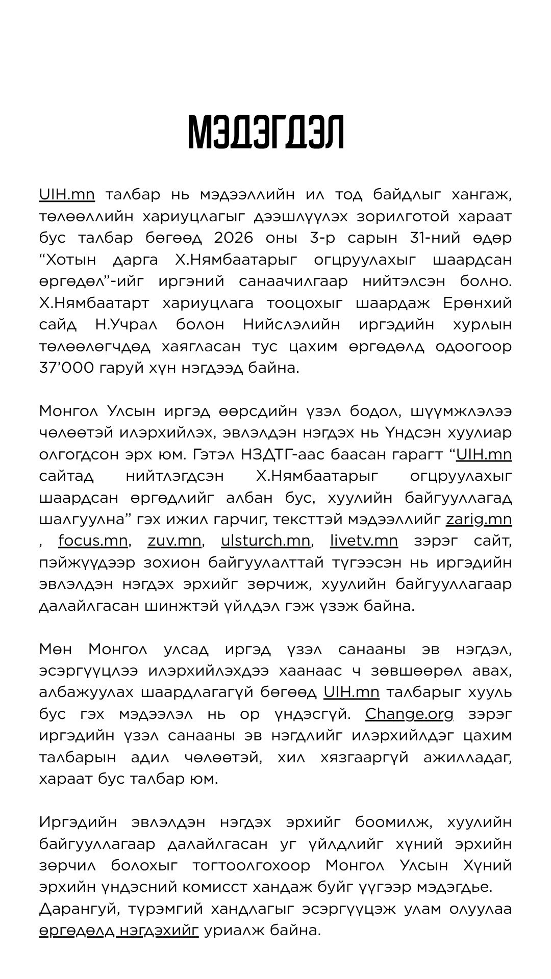 UIH.mn талбар нь мэдээллийн ил тод байдлыг хангаж, төлөөллийн хариуцлагыг дээшлүүлэх зорилготой хараат бус талбар бөгөөд 2026 оны 3-р сарын 31-ний “Хотын дарга Х.Нямбаатарыг огцруулахыг шаардсан өргөдөл”-ийг иргэний санаачилгаар нийтэлсэн болно.