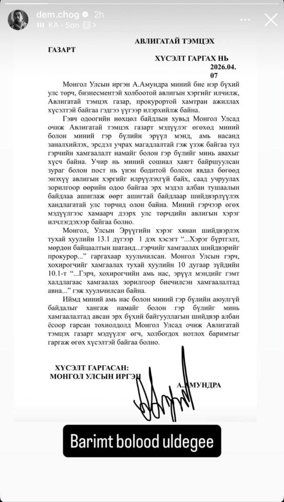 Гэр бүлийн гишүүдийн эрүүл мэнд, аюулгүй байдалд заналхийлэл учирч болзошгүй нөхцөл үүсээд байгааг онцолжээ. Мөн өөрийн цахим орчинд байршуулсан баримт, мэдээллүүд нь бодитой бөгөөд үнэн зөв болохыг тэмдэглэсэн байна.