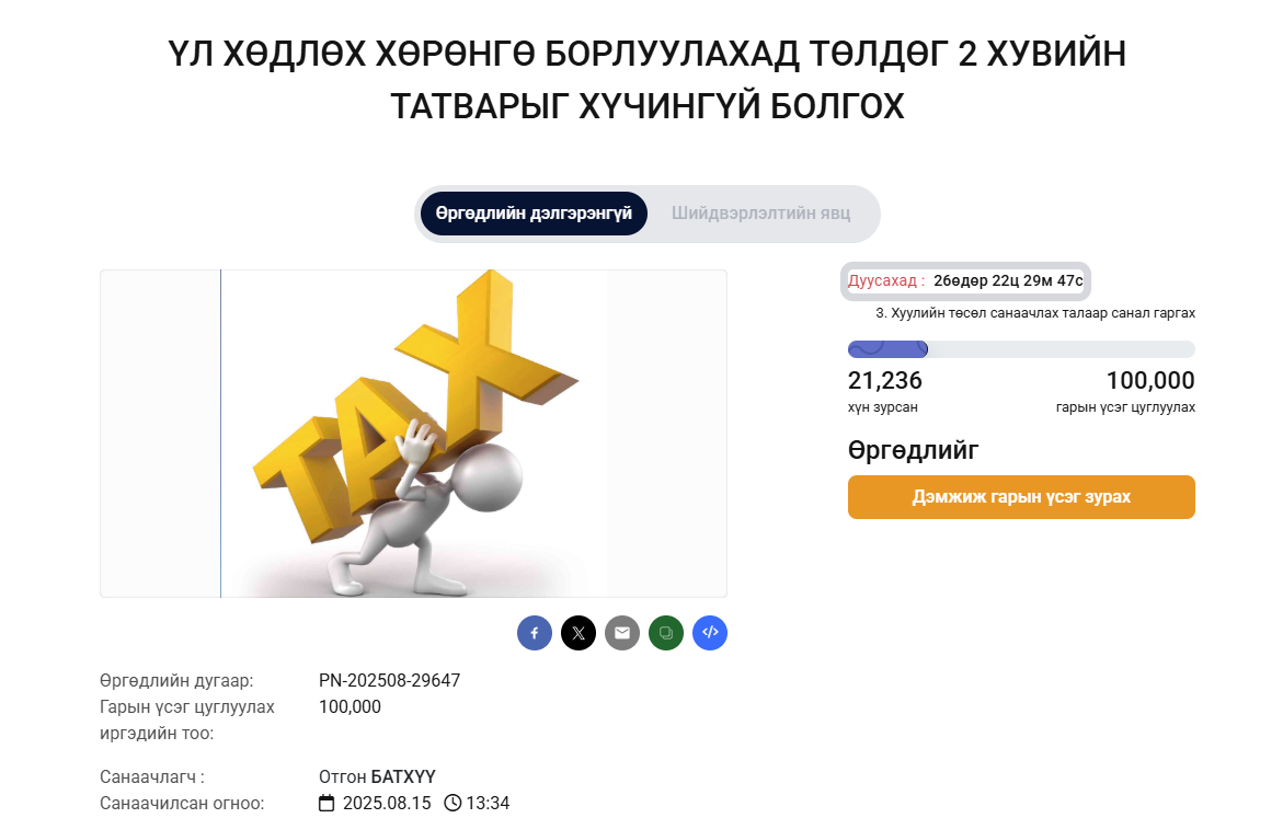 Үл хөдлөх хөрөнгө борлуулахад төлдөг 2 хувийн татварыг хүчингүй болгох шаардлагыг 21 мянган хүн дэмжжээ