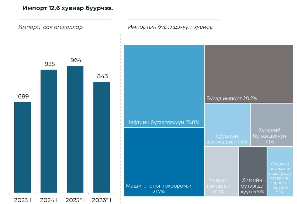 Харин импорт 843 сая долларт хүрчээ. Энэ нь өнгөрсөн оны мөн үеэс 12 хувиар буурсан дүн юм. Тухайлбал, 73 сая доллароор суудлын автомашины импорт буурсан байна.