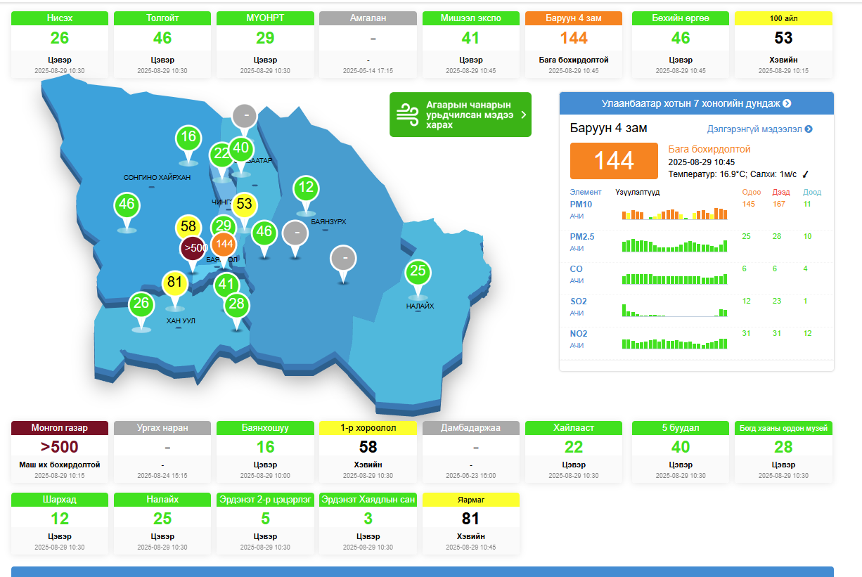 Тэгвэл өнөөдөр (2025.08.29) Улаанбаатар хотод мөн л +21 градусын дулаан. Гэтэл өглөөний 10:45 цагийн байдлаар Баруун 4 зам орчмын PM10 буюу агаар дахь нарийн ширхэгт тоосонцрын хэмжээ 144 буюу бага бохирдолтой гэх түвшинд хүрчээ. Энэ хэмжээ нь хэт мэдрэг хүмүүсийн эрүүл мэндэд сөргөөр нөлөөлөхүйц үзүүлэлт юм.