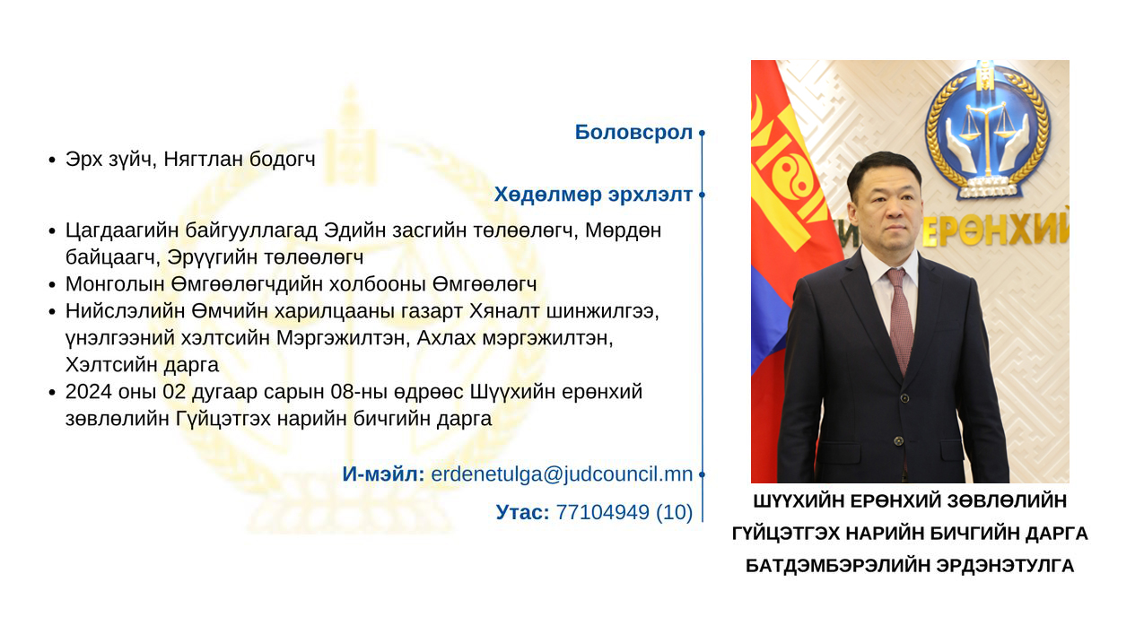 Тус асуудалд холбогдсон Шүүхийн ерөнхий зөвлөлийн Гүйцэтгэх нарийн бичгийн дарга Б.Эрдэнэтулга нь 2024 оны хоёрдугаар сарын 8-нд тус албан тушаалд томилогдсон байна.