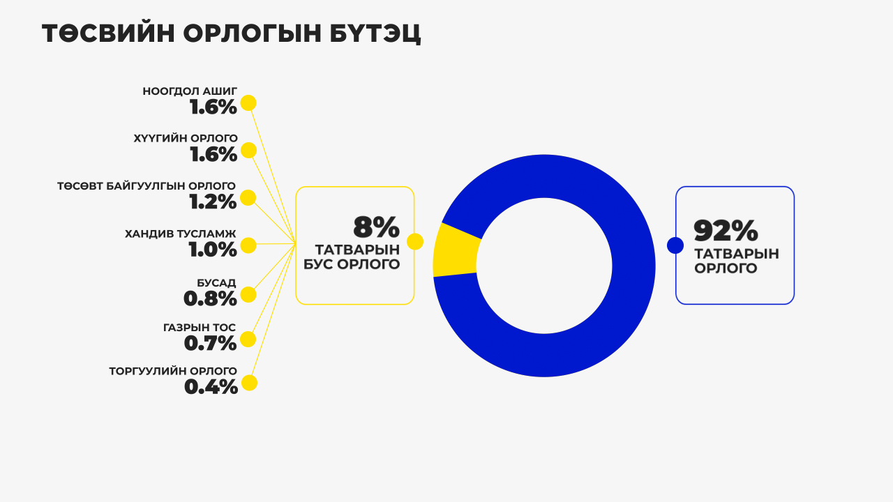 Монгол Улсын төсвийн орлогын бүтцийг харвал татварын орлого 85%, татварын бус орлого 5.4%-ийг буюу дөнгөж 1.8 их наяд төгрөгийг бүрдүүлж байна. Татварын бус орлогын 365 тэрбум төгрөг нь гадаадын тусламж байгаа юм.