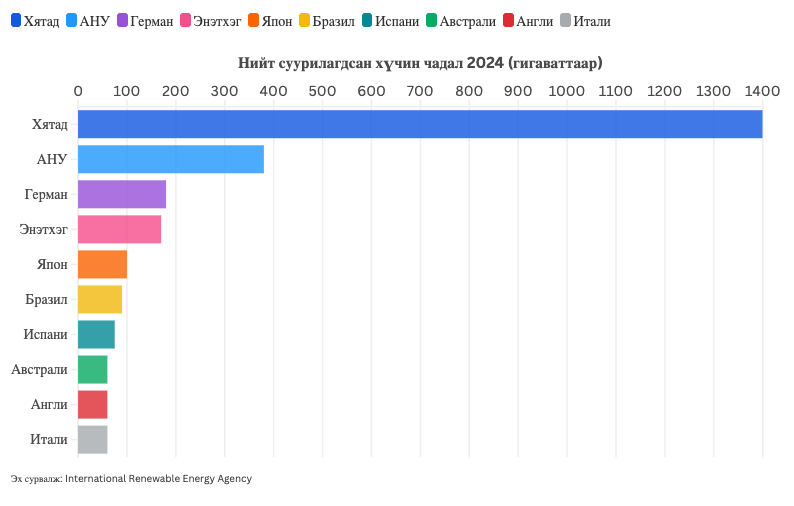 Мөн БНХАУ сэргээгдэх эрчим хүчний(салхи нарны) ашиглалтаар дэлхийд тэргүүлж байна. Тэд 2030 он гэхэд 1,200 гигаваттын хүчин чадалтай болно гэж амласан байсан ч энэ зорилгоо 2024 онд буюу зургаан жилийн өмнө биелүүлсэн байна.