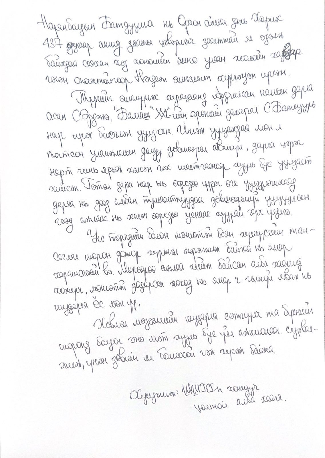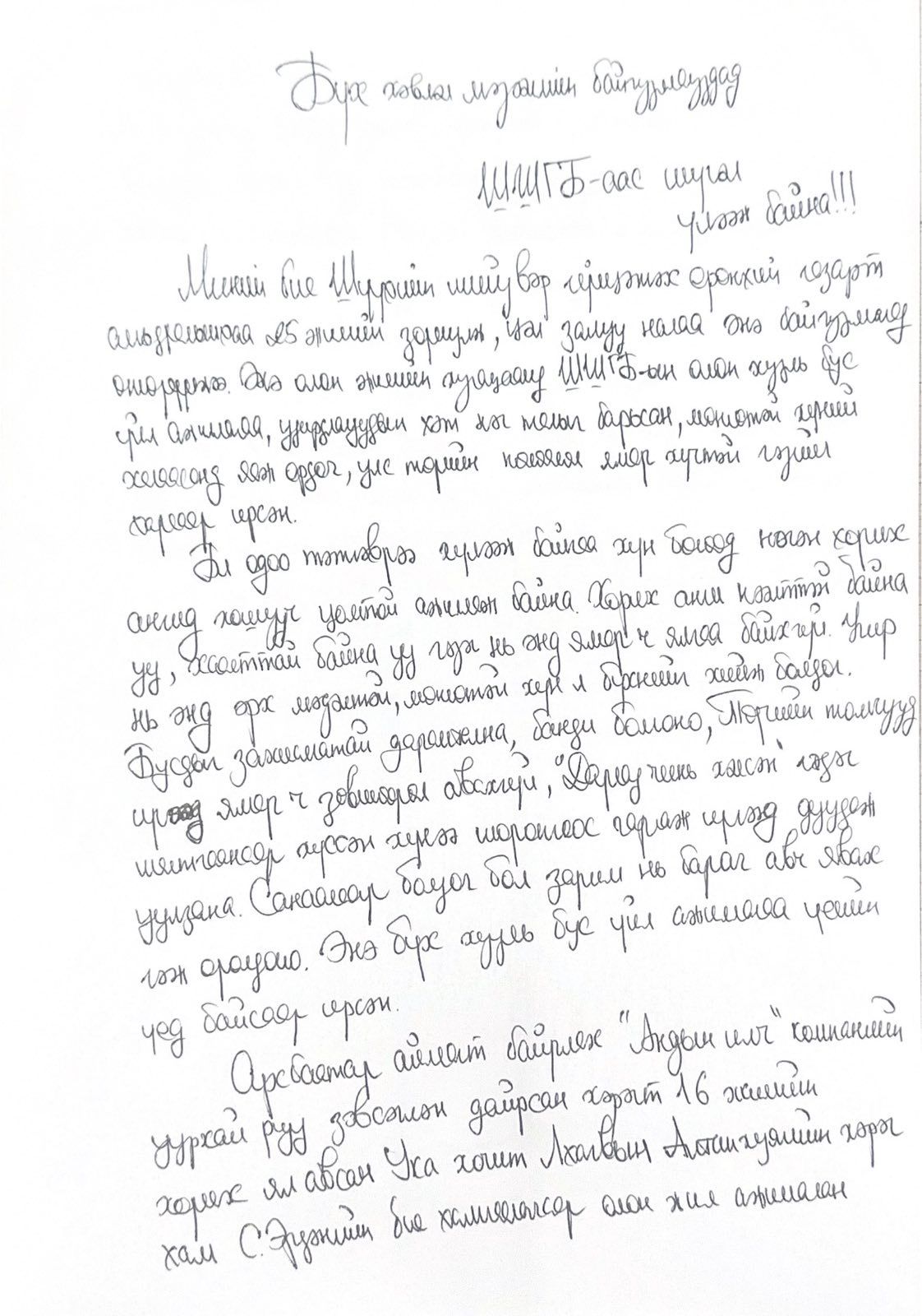Тус хүсэлтэд “Миний бие Шүүхийн шийдвэр гүйцэтгэх ерөнхий газарт амьдралынхаа 25 жилийг зориулж, цэл залуу насаа энэ байгууллагад өнгөрүүлжээ. Энэ олон жилийн хугацаанд Шүүхийн шийдвэр гүйцэтгэх байгууллагын олон хууль бус үйл ажиллагаа, удирдлагуудын хэт нэг талыг барьсан, мөнгөтэй хүний халаасанд яаж ордог, улс төрийн нөлөөлөл ямар хүчтэй гэдгийг харсаар ирсэн.