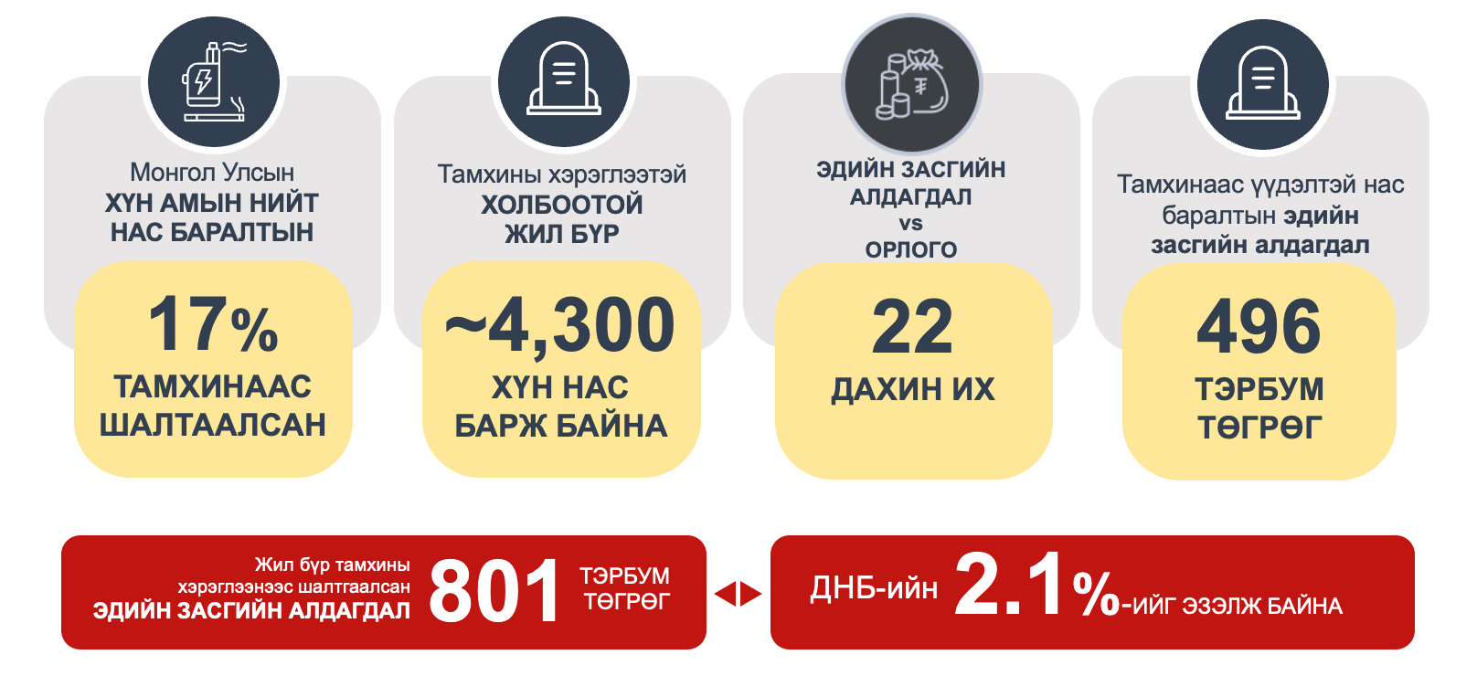 Тамхины хэрэглээнээс шалтгаалсан эдийн засгийн алдагдал 800 тэрбум төгрөг давж, ДНБ-ий 2.1 хувьд хүрээд буй. Энэ нь тамхитай холбоотой татвараас олж байгаа орлогоос 22 дахин алдагдалд тооцогдож байна.