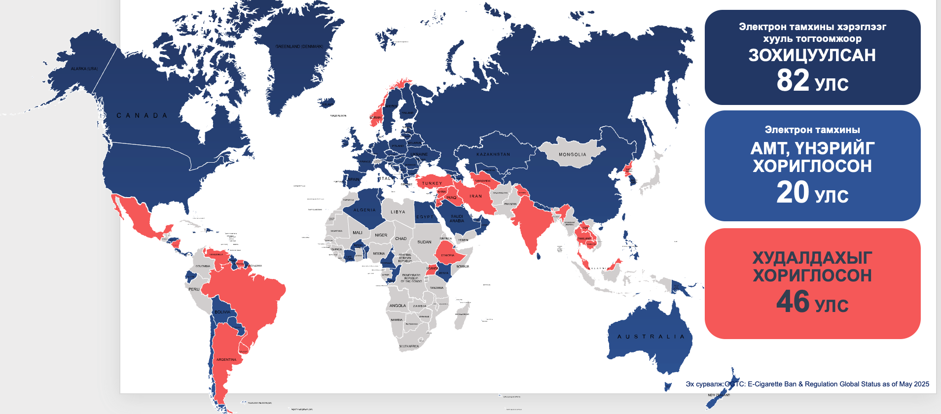 Тамхины сайн засаглалын Дэлхийн төв (GGTC)-өөс танилцуулсан судалгаагаар 2025 оны байдлаар 82 улс электрон тамхийг хуулиар зохицуулж, 20 улс амт, үнэрийг нь хориглож, 46 улс бүрэн хориод байна. Харин Монгол Улс энэ талаар ямар ч зохицуулалтгүй 74 орны нэгд бичигдэж байгаа юм.