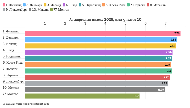 Харин 2023 онд бид 61-т жагсаж байсан бол үүнээс хойш 16 байр ухарчээ. Харин жагсаалтын тэргүүнд Финланд улс байгаа бол хамгийн сүүлд Афганистан улс 1.72 оноотойгоор орсон байна.