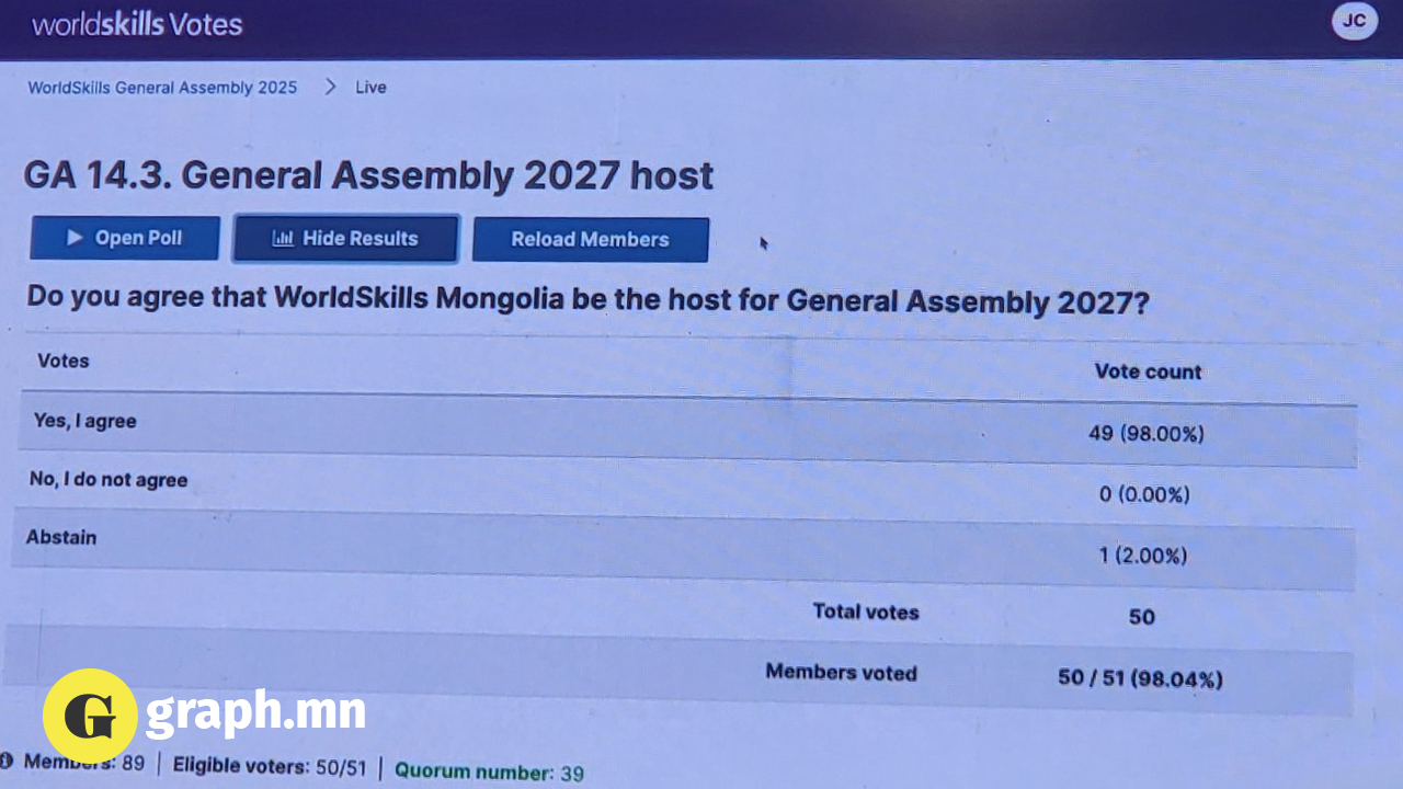 Хорват Улсын Дубровник хотноо зохион байгуулагдаж байгаа “WorldSkills General Assembly Dubrovnik 2025”-аас 2027 онд энэхүү ассамблейг зохион байгуулах орныг сонголоо. Энэхүү эрхийн төлөө Швейцар, Ямайка, Шинэ Зеланд, Монгол зэрэг улсууд нэрээ дэвшүүлээд байсан юм.