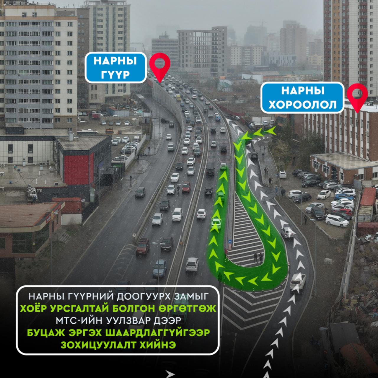 Үүнтэй холбоотойгоор “Нарны хороолол” талаас ирэх жолооч нар МТС-ийн уулзвараар буцаж эргэх шаардлагагүй шууд Нарны гүүрний зүүн талаар буцаж эргэх эргэлт хийн хотын төв рүү шууд орох боломжтой.