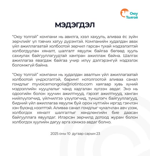 “Оюу толгой” компани нь худалдан авалтын үйл ажиллагаатай холбоотой үндэслэлтэй, баримт нотолгоотой аливаа санал гомдлыг myvoicemongolia@riotinto.com хаягаар хувь хүний мэдээллийн нууцлалыг чанд хадгалан хүлээн авдаг.