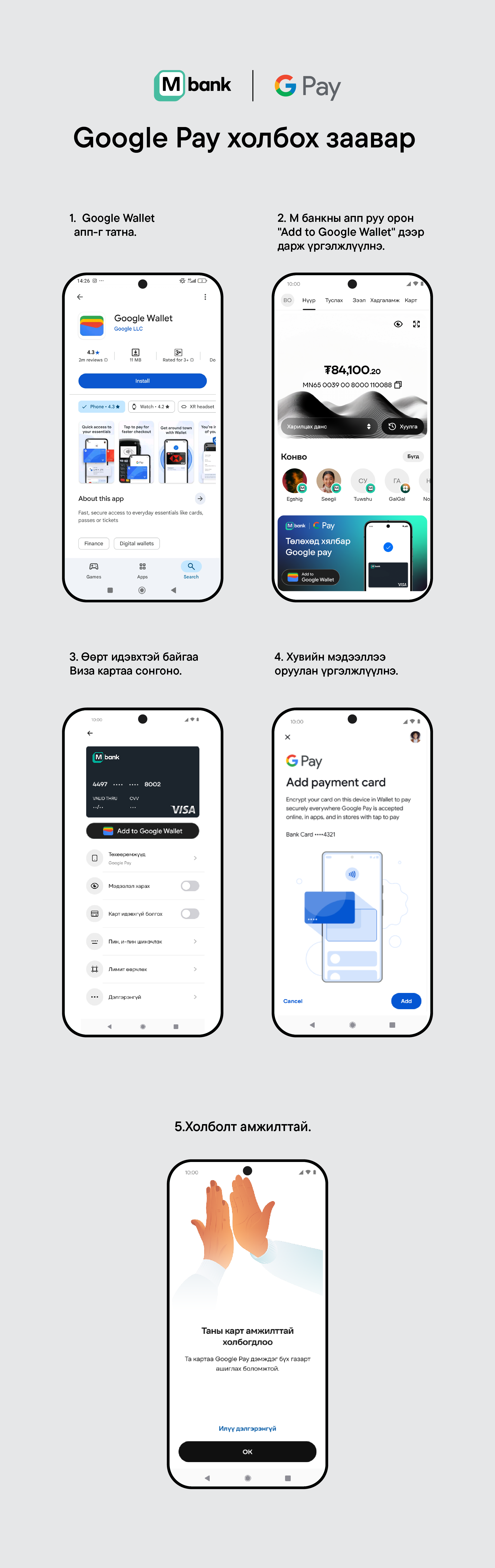 М банкны Google Pay төлбөрийн системийг нэвтрүүлэхэд дэлхийн 200 гаруй улсад хүлээн зөвшөөрөгдсөн Visa олон улсын байгууллага хамтран ажиллалаа. Ийнхүү М банк Монгол Улсад Google Pay үйлчилгээг нэвтрүүлсэн гурав дахь арилжааны банк болж байна. М виза карт эсвэл М виза виртуал картаа Google Wallet-д холбож эхний гүйлгээгээ хийгээд ₮10,000 урамшуулал аваарай.