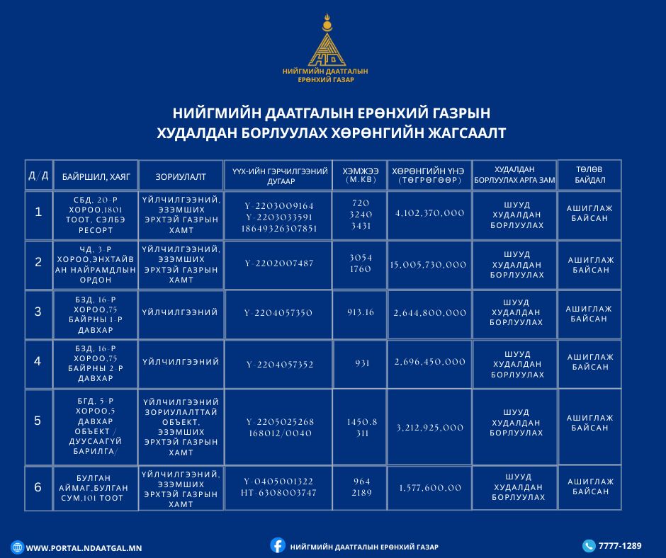 Шууд худалдан борлуулах хөрөнгийн талаарх дэлгэрэнгүй мэдээллийг ажлын өдрүүдэд 08:30-17:30 цагийн хооронд 11-321138, 8076-0777 утсаар холбогдож лавлана уу.
