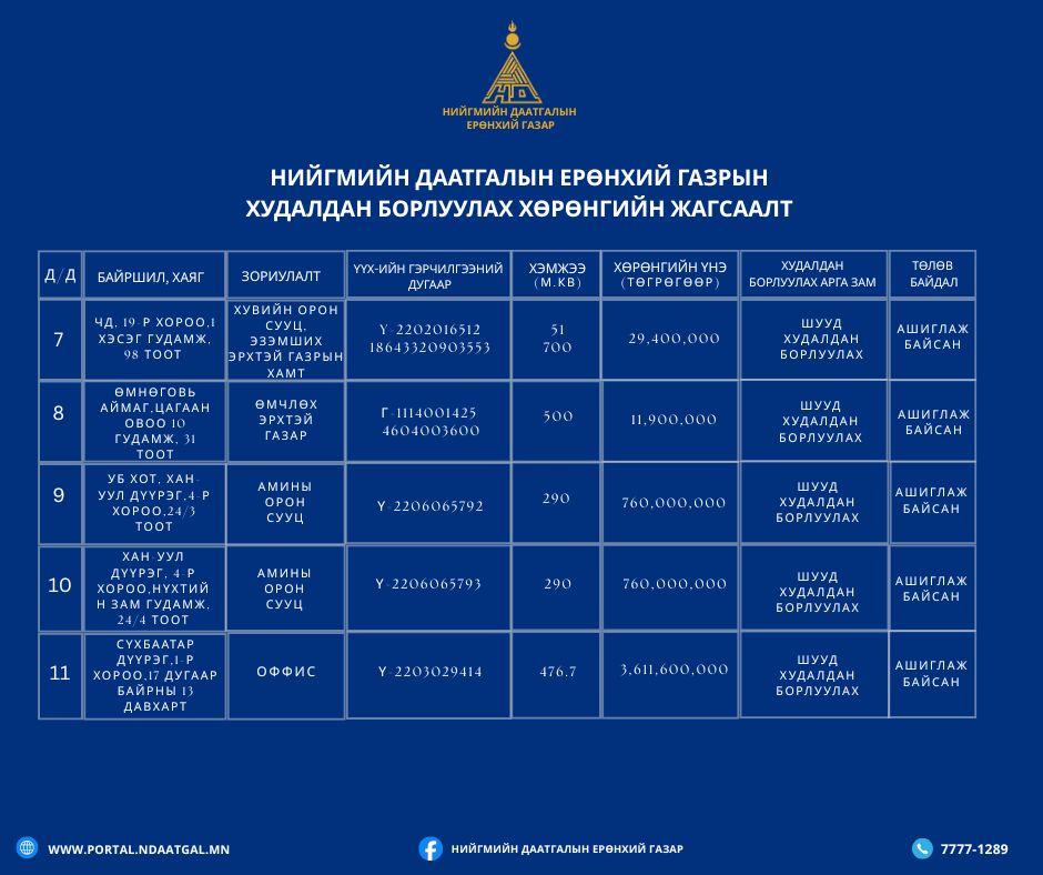 Худалдан борлуулагдаагүй үлдсэн 37 ширхэг хөрөнгөнөөс шууд худалдан борлуулах боломжтой 11 үл хөдлөх хөрөнгийн мэдээллийг нээлттэй мэдээллэж байна.