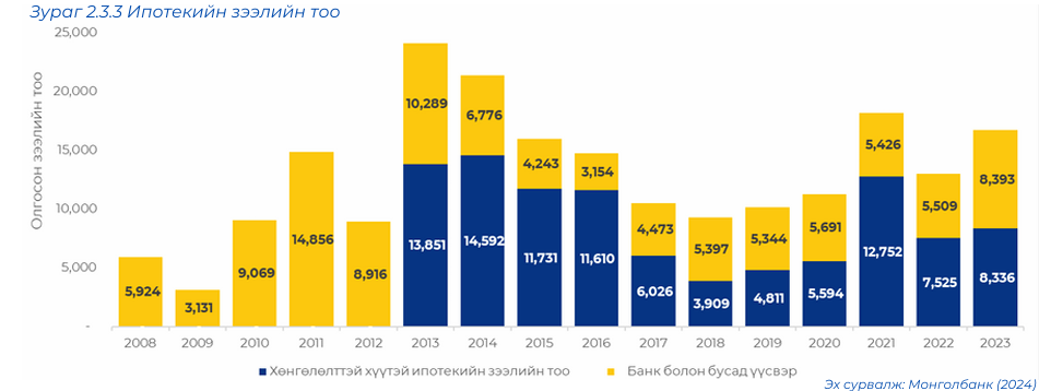 2024 онд 120 мянган өрх 7.7 их наяд төгрөгийн ипотекийн зээлээр амьдрах нөхцөлөө сайжруулж, 40 хувь нь гэр хорооллоос орон сууцанд шилжсэн.