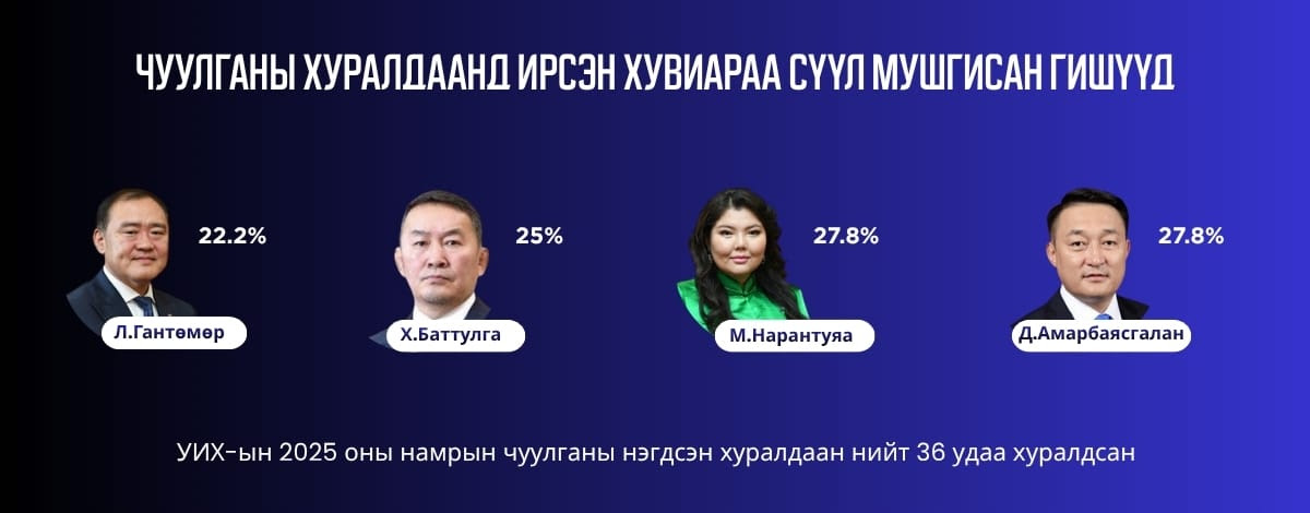 Тодруулбал Д.Бямбасүрэн, У.Хүрэлсүх, Д.Гантулга, Д.Сумъяабазар, Ж.Мөнхбат, Х.Нямбаатар гэсэн зургаан хүн өөрийн хүсэлтээр УИХ-ын гишүүнээс чөлөөлөгдөж байсан. Харин ерөнхий прокурорын саналаар 16 хүнийг түдгэлзүүлэх санал оруулж ирснийг УИХ хэлэлцээд 10 хүнийг түдгэлзүүлэх шаардлагагүй гэж үзсэн бол Д.Энхбаатар, Д.Баттулга, С.Батчулуун, Н.Номтойбаяр, Т.Аюурсайхан, Д.Бат-Эрдэнэ нарыг түдгэлзүүлсэн байсан түүхтэй.
