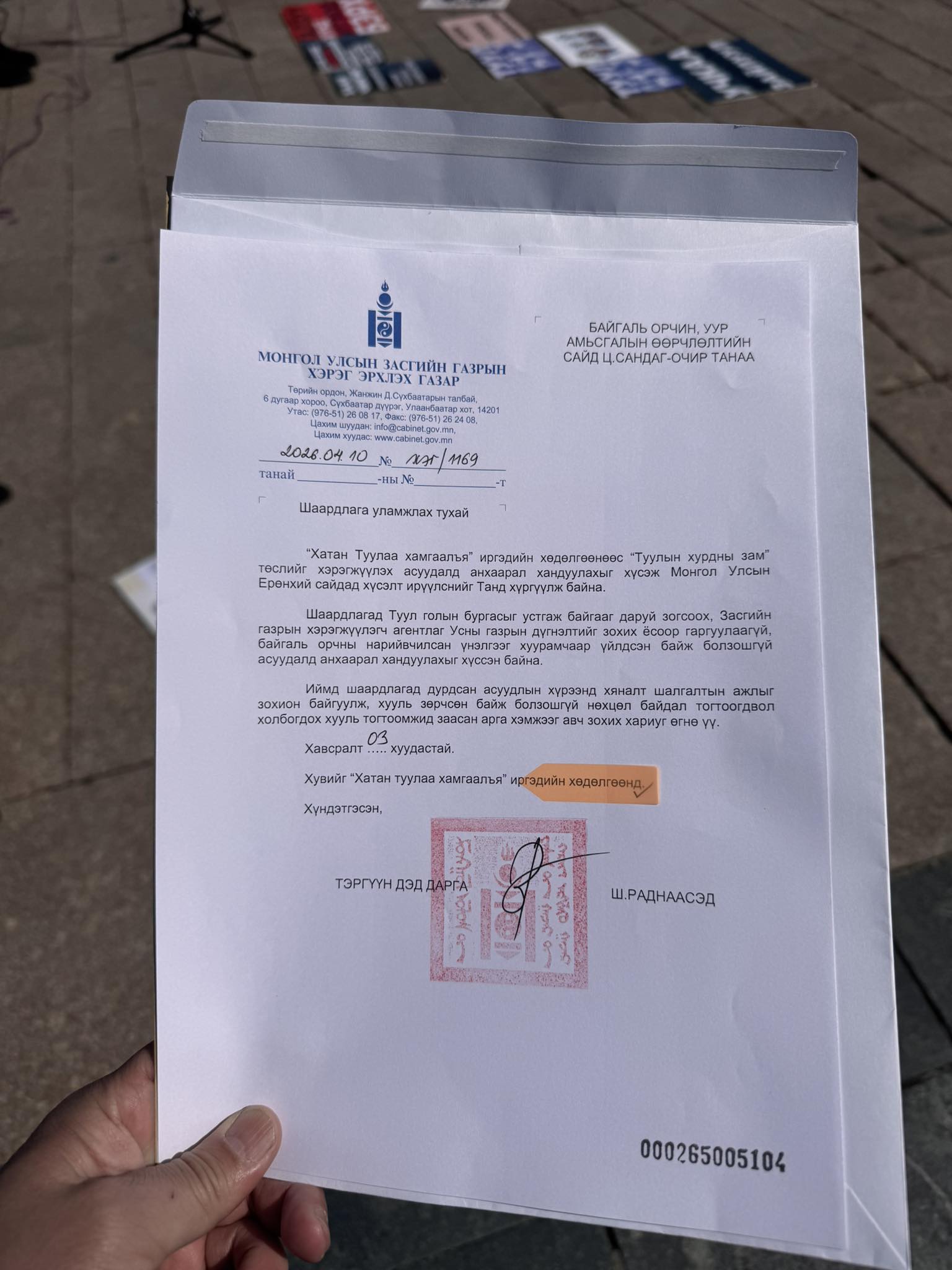 Ерөнхий сайд “Туулаа хамгаалъя” хөдөлгөөнийхний албан бичигт хариу өгчээ. Туул голоо хамгаалъя гэсэн иргэд сүүлийн 20 орчим хоног өдөр бүр 12 цагаас тайван жагсаал хийж энэхүү Туулын хурдны замын ажлыг түр биш бүр зогсоохыг шаардаж байгаа. Тэд жагсахын хажуугаар Туул голыг хамгаалах үүрэг хүлээсэн төрийн бүх шатны байгууллагад албан бичгээр хандаад байгаа юм.